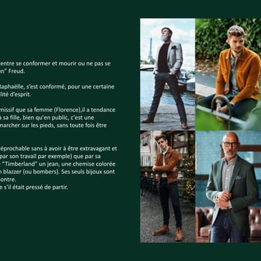Je voulais que chaque personnage soit définissable par sa tenue. Ainsi, Raphaëlle et Agnès ont les tenues les plus fantasques, la première idolâtrant la deuxième et souhaitant s'affirmer comme elle. Les parents ne sont habillés dans une mode "casual chic", suffisamment bien pour paraitre beau, mais pas trop habillé, car leur belle famille ne méritent pas tant d'effort. Alexis quant à lui devait porter la tenue la plus basique de tout le groupe, cependant, elle devait être froissée, trahissant le fait qu'il ait oublié le repas.